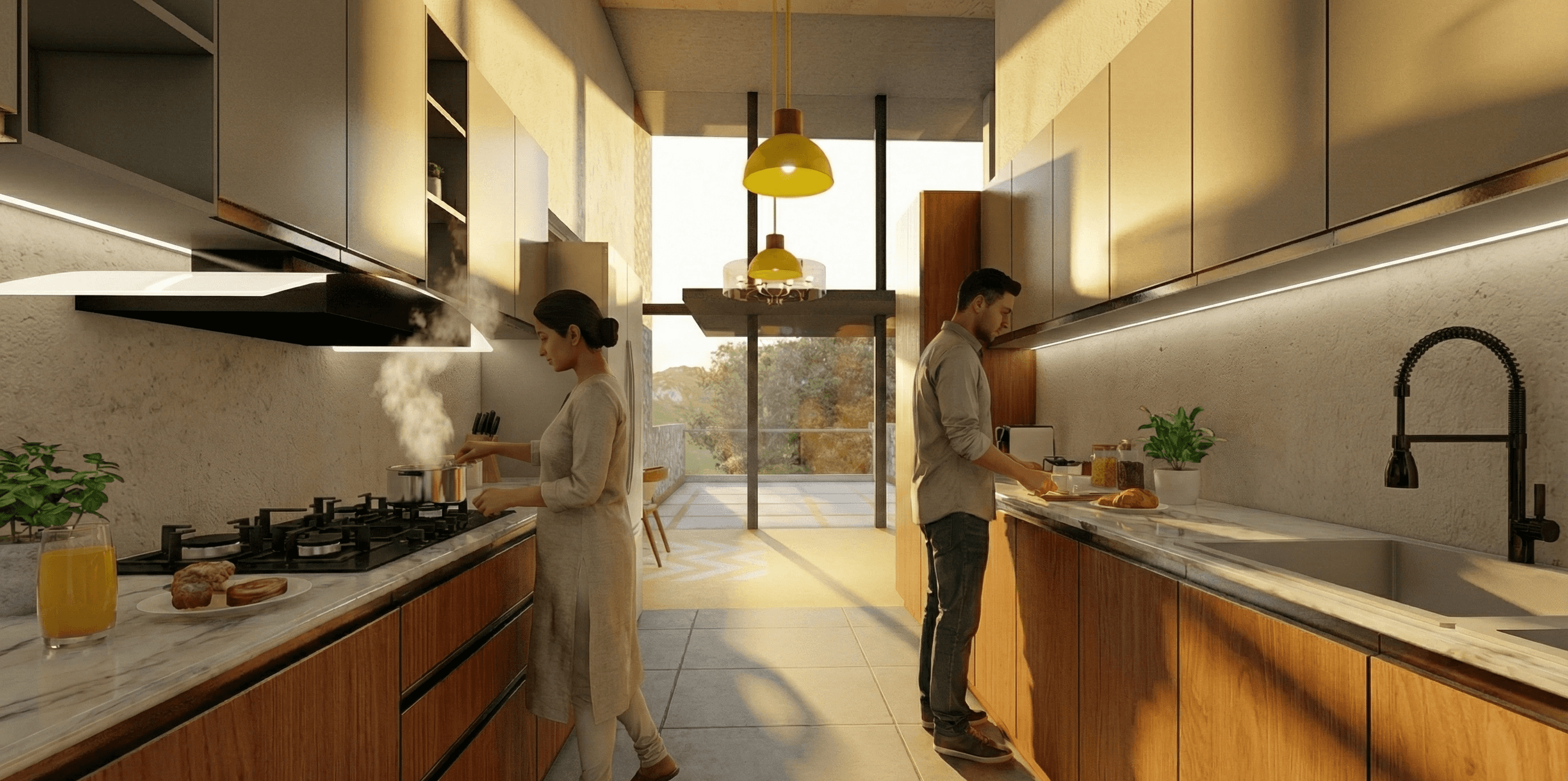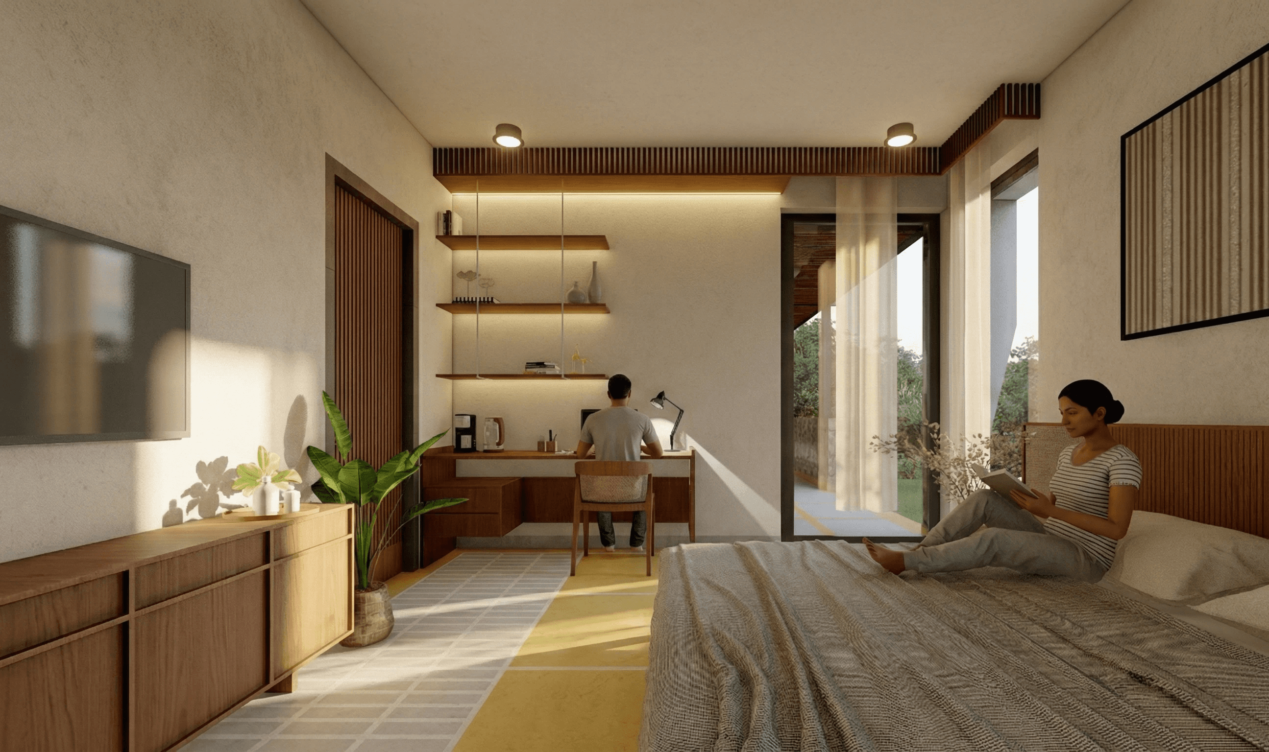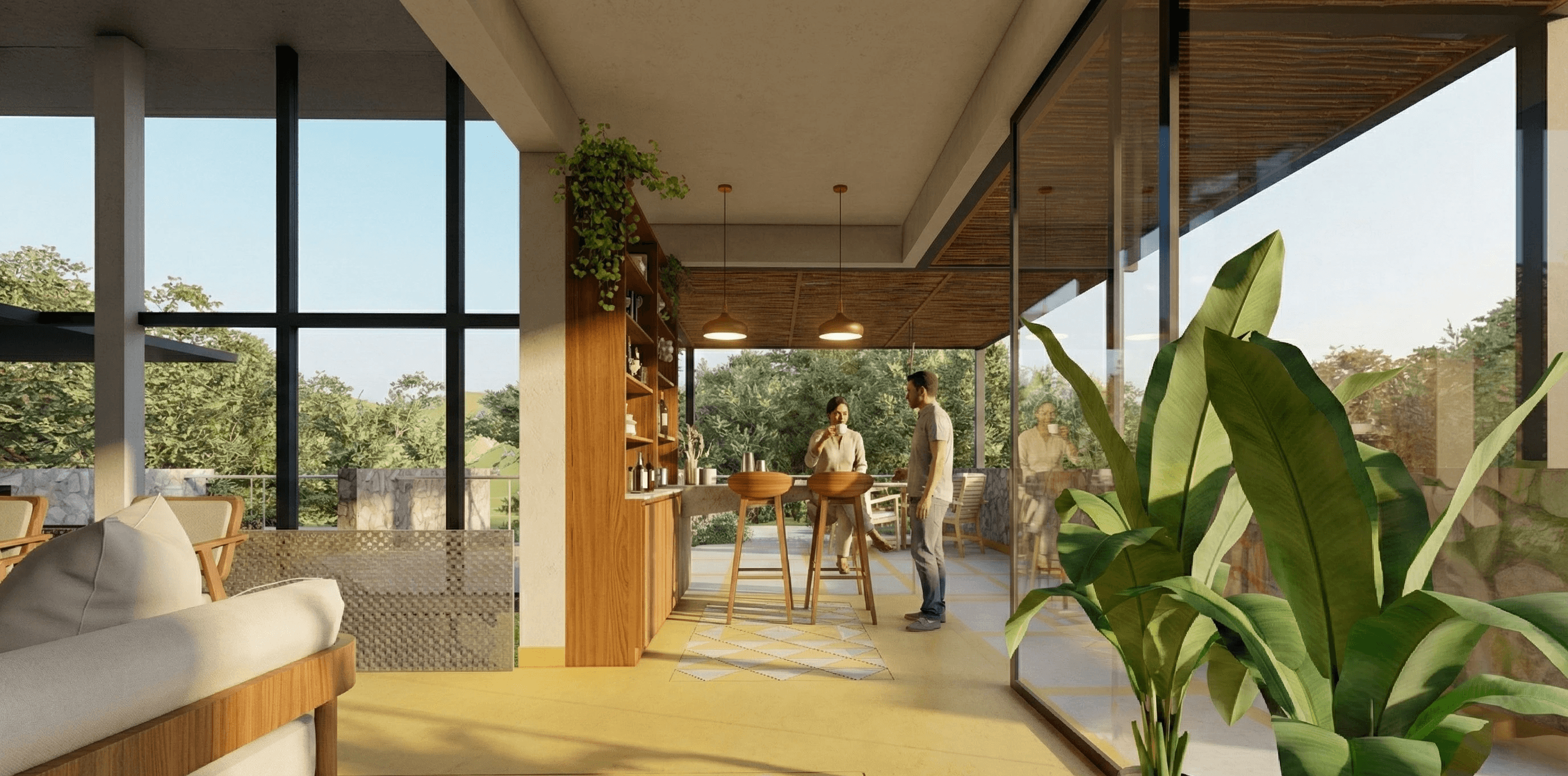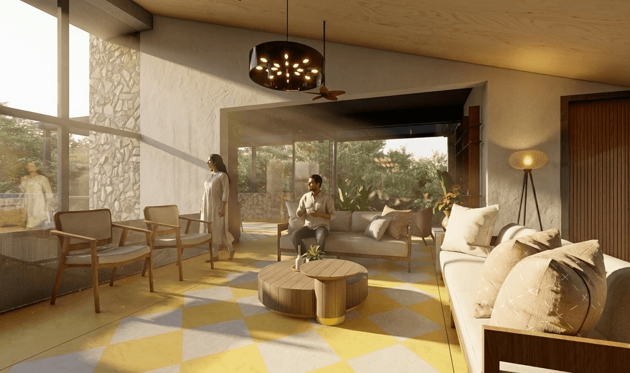The farmhouse is organized across two levels that follow the natural slope of the site. Instead of cutting into the hill, the architecture is embedded within it, allowing the terrain to shape the built form. A sloped green roof extends from the landscape and becomes a walkable terrace, turning the building itself into part of the land. The front of the house remains fully open, bringing light deep into the living spaces and creating a continuous connection between interiors and the valley beyond.