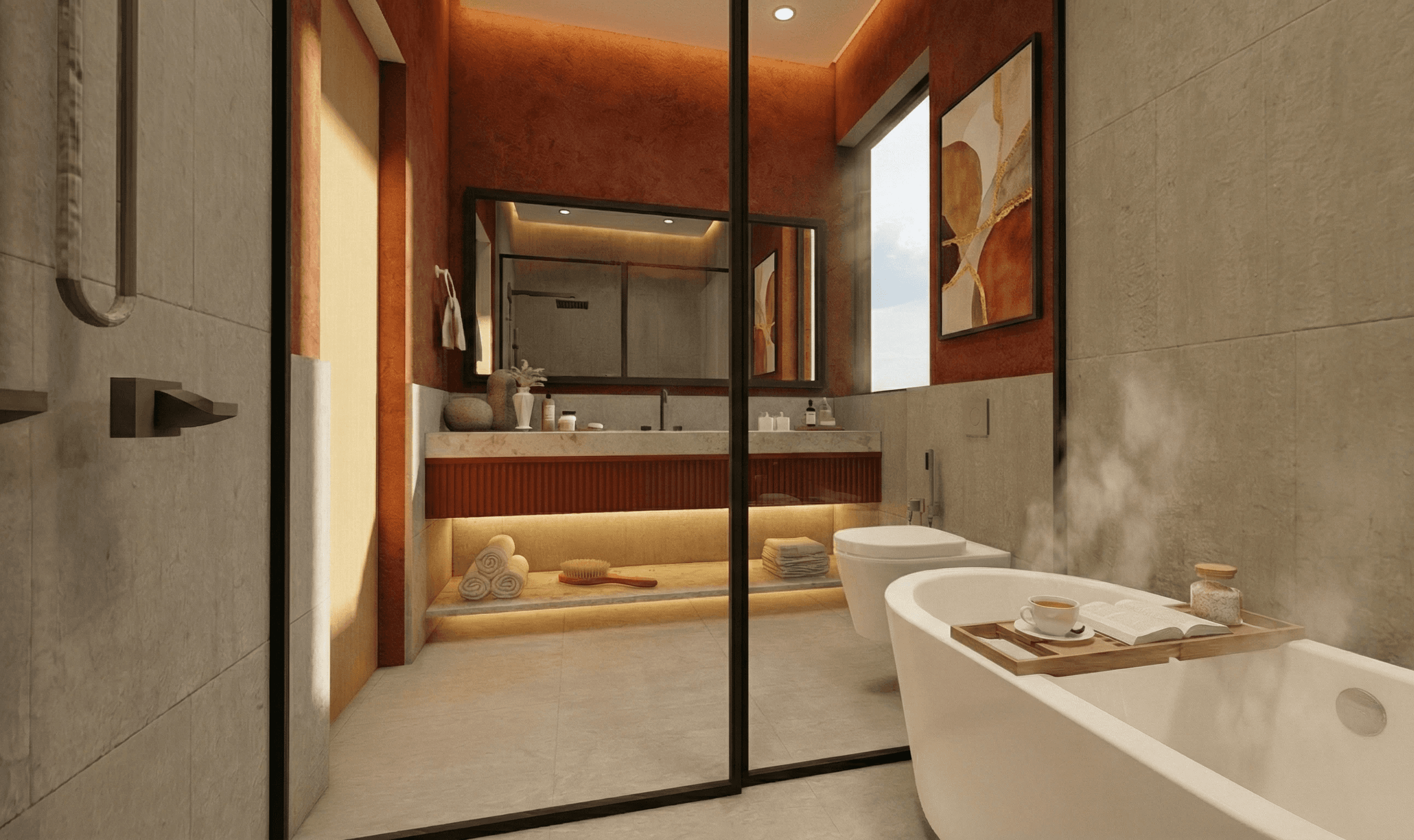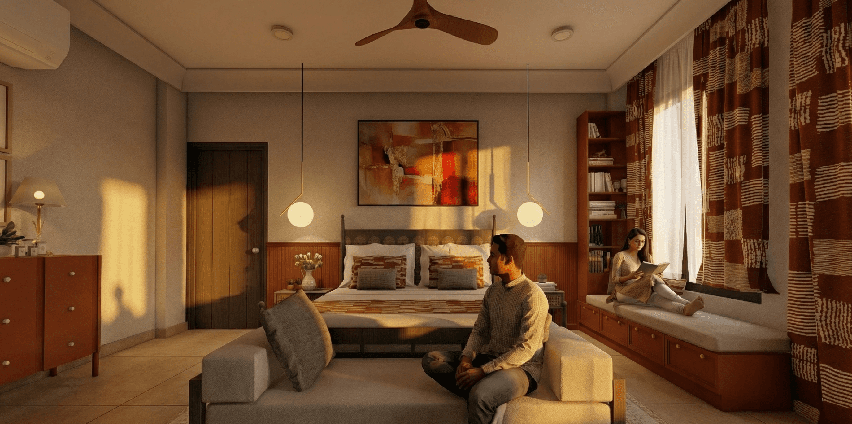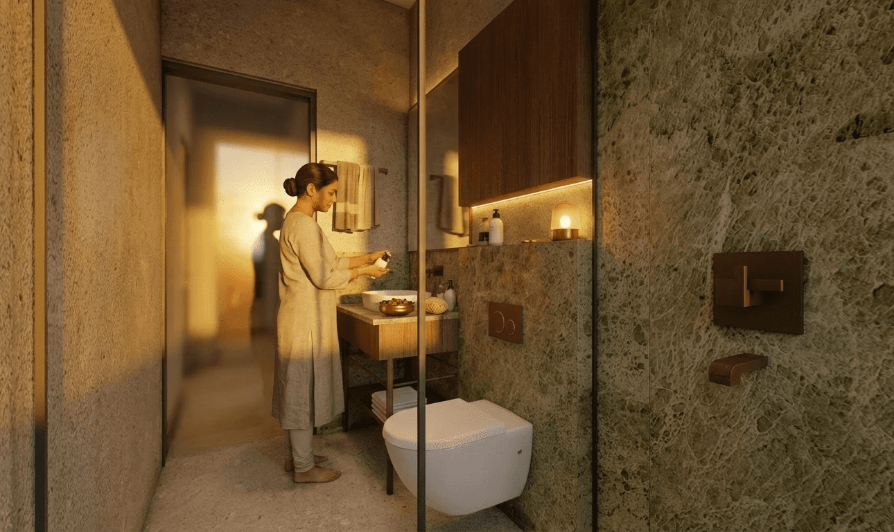Local stone is used as the primary exterior material to give the house durability and a strong regional character. Inside, built-in seating, niches, and walk-in wardrobes are integrated into the layout to make the spaces efficient and comfortable without unnecessary finishes. Carefully shaped light and shadow soften the interior throughout the day, creating a home that feels contemporary, calm, and closely connected to how the family lives.