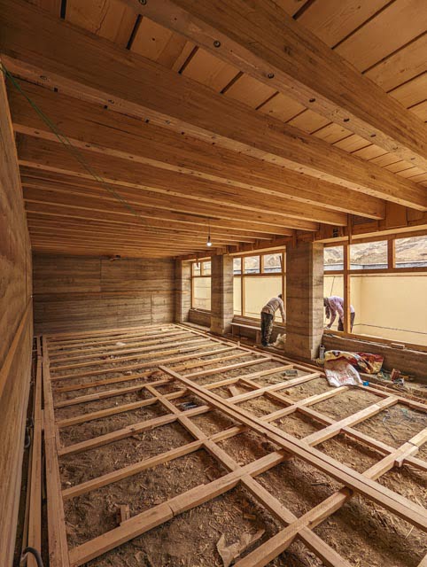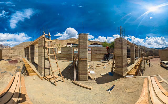 The SDPS campus was developed in collaboration with Chybik + Kristof Associated Architects, with The Blue Khirki responsible for project management and on-site realization. The architecture draws from traditional Ladakhi building methods while reinterpreting them through modern construction techniques. Insulated structural rammed-earth walls and timber ceilings form the primary building system, providing thermal mass, durability, and a strong connection to local material culture.