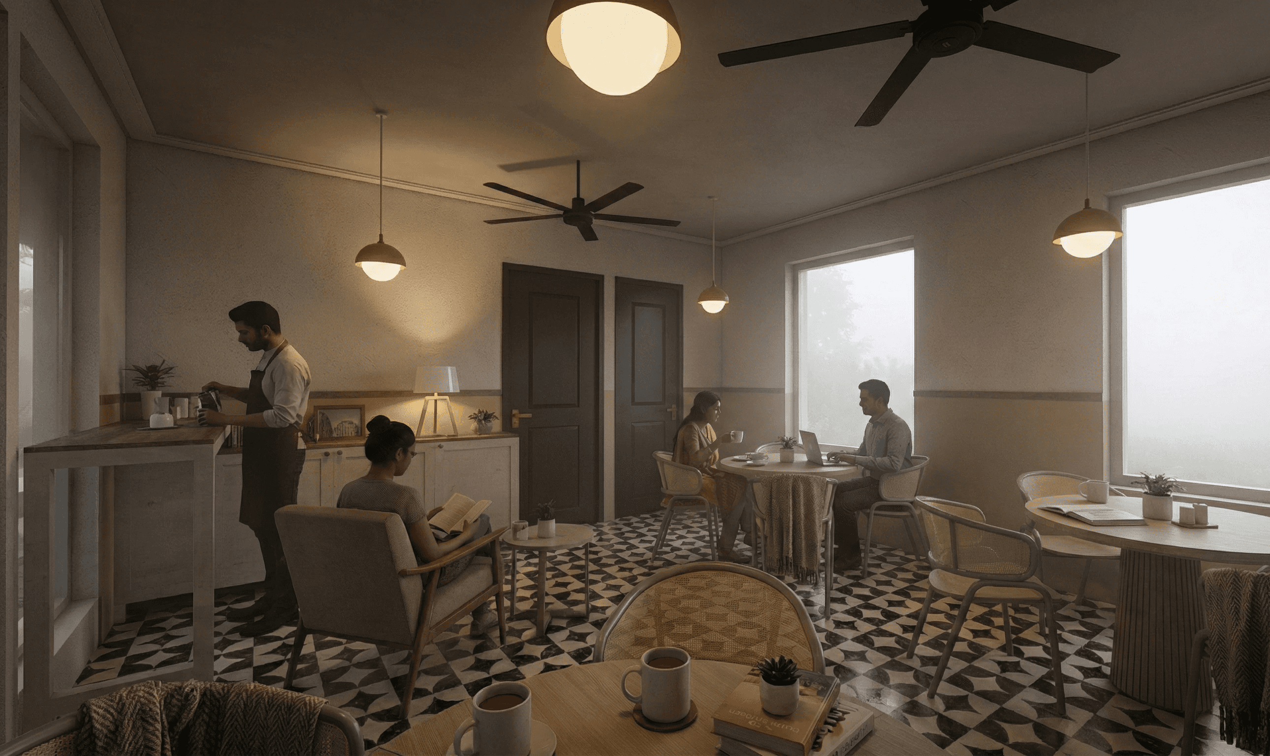 At the front of the site, a coffee lounge functions both as a public café and as a buffet space for guests, activating the street edge while remaining connected to the internal courtyard. The architecture blends simple European elements such as arches with local Dehradun features like sloped roofs and regional materials, creating a building that feels contemporary while remaining appropriate to its setting and climate.