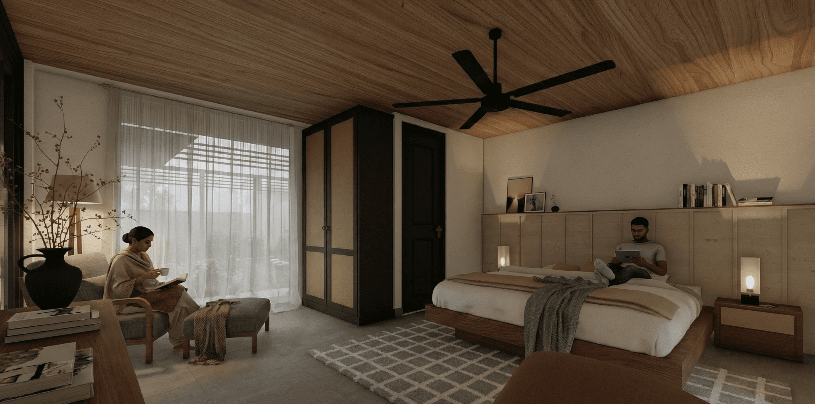The BnB is planned as a small hospitality campus rather than a single block. Entry is guided alongside a linear water body, leading into a central courtyard that organizes movement and brings light into the depth of the site. Guest rooms are arranged around this courtyard across two levels, while balconies and verandahs open toward the valley, ensuring every room receives light, air, and a clear view. A loft level above the courtyard accommodates service and storage areas, keeping the guest areas quiet and uncluttered.