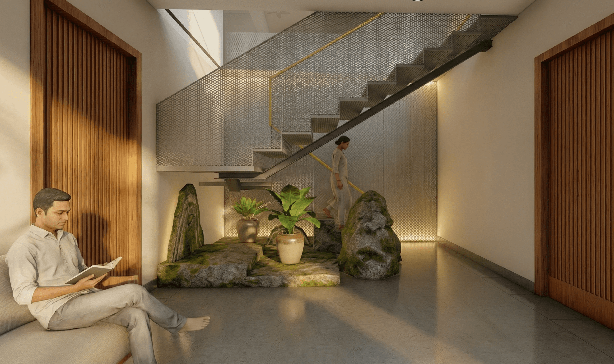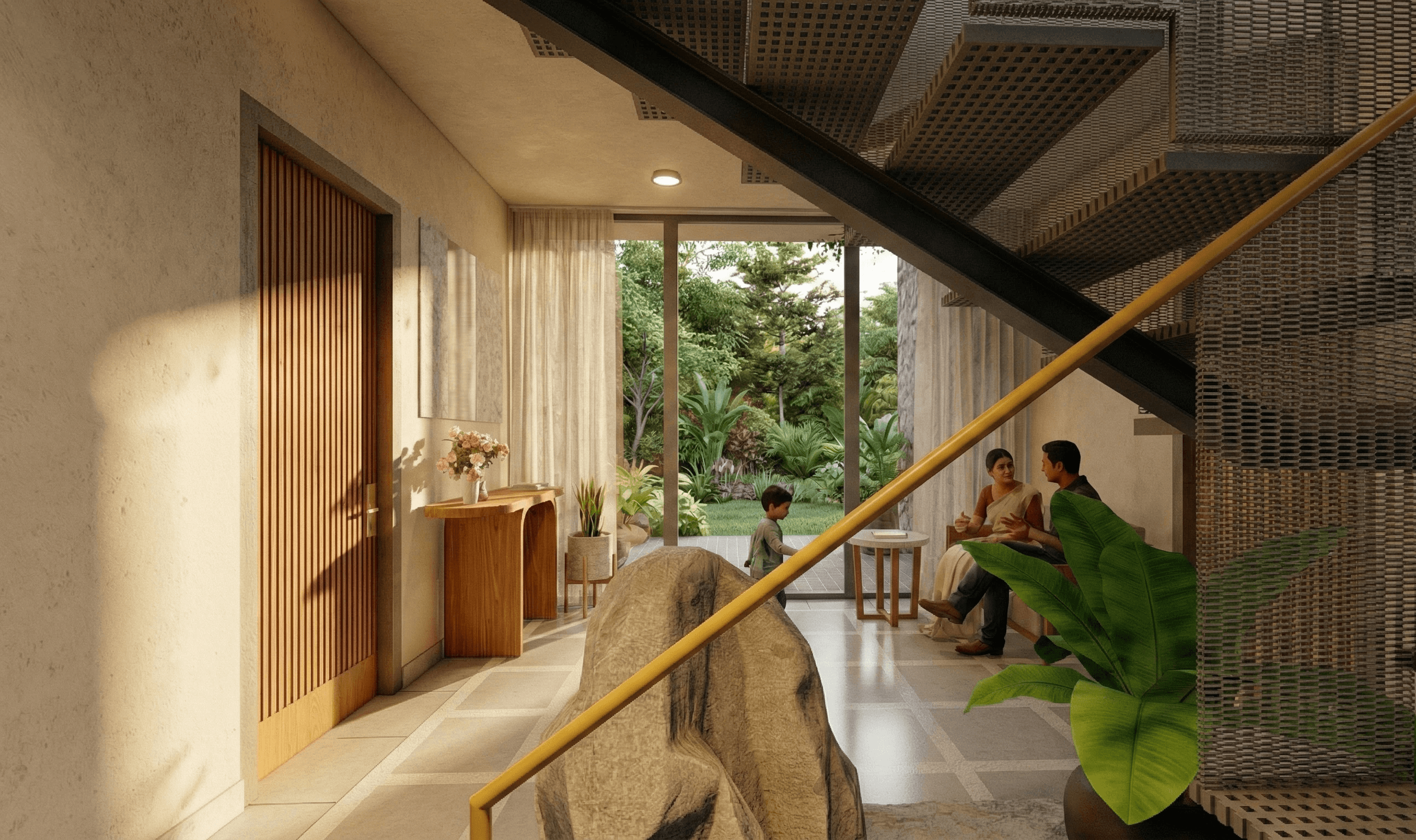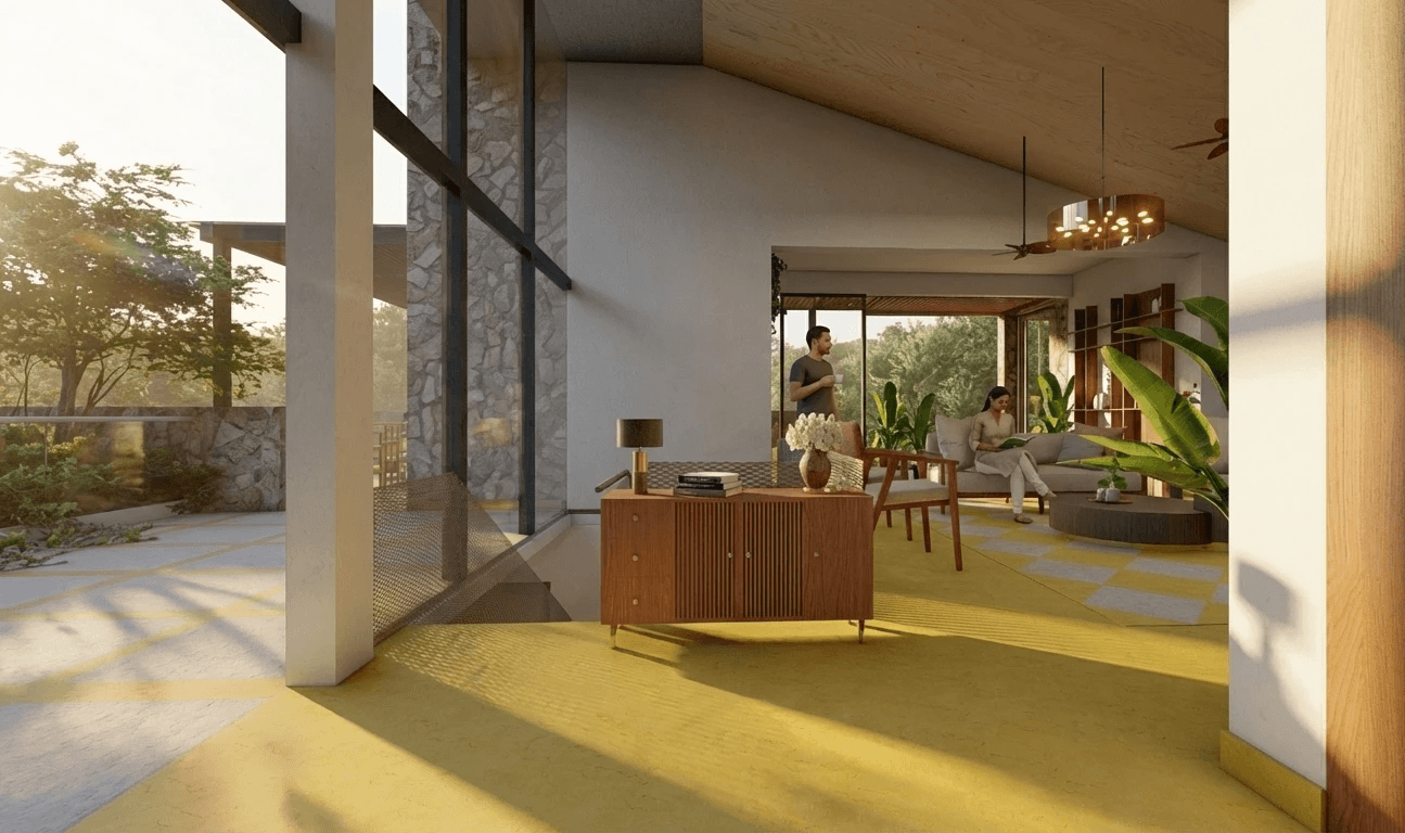 The farmhouse is organized across two levels that follow the natural slope of the site. Instead of cutting into the hill, the architecture is embedded within it, allowing the terrain to shape the built form. A sloped green roof extends from the landscape and becomes a walkable terrace, turning the building itself into part of the land. The front of the house remains fully open, bringing light deep into the living spaces and creating a continuous connection between interiors and the valley beyond.