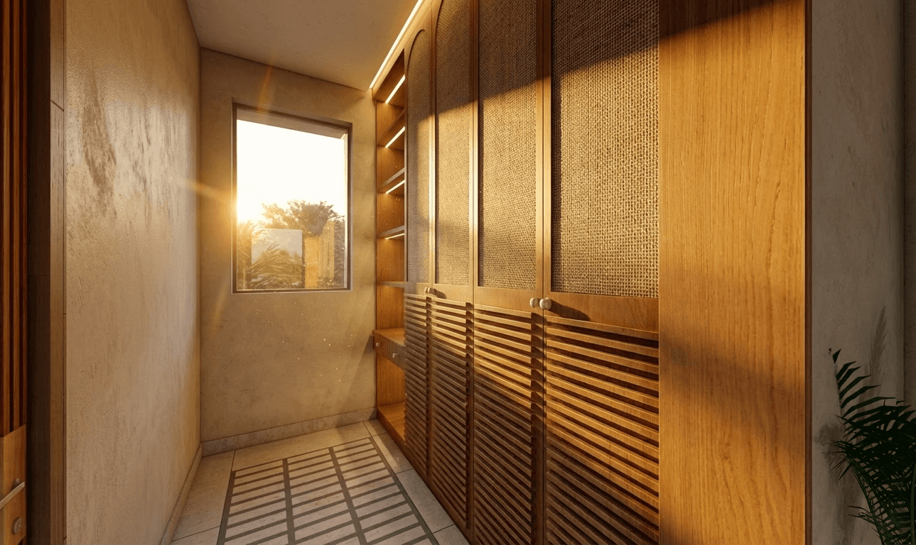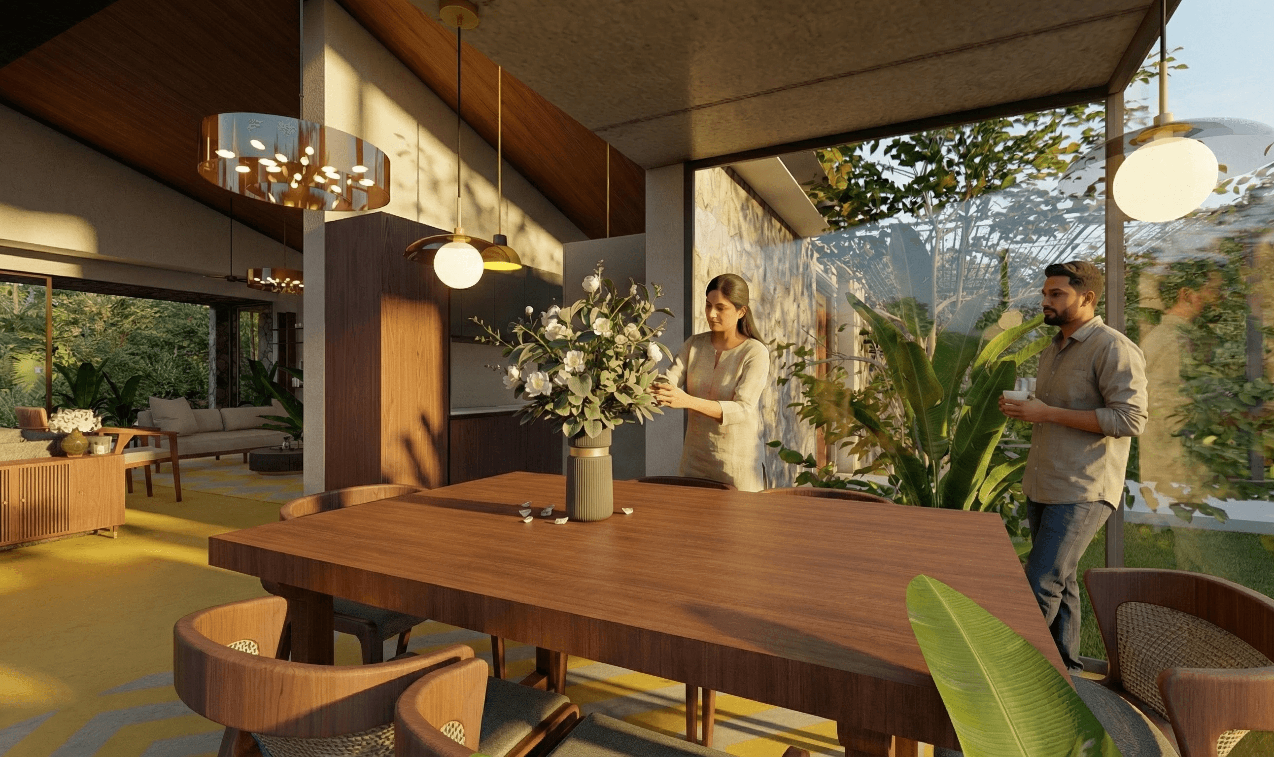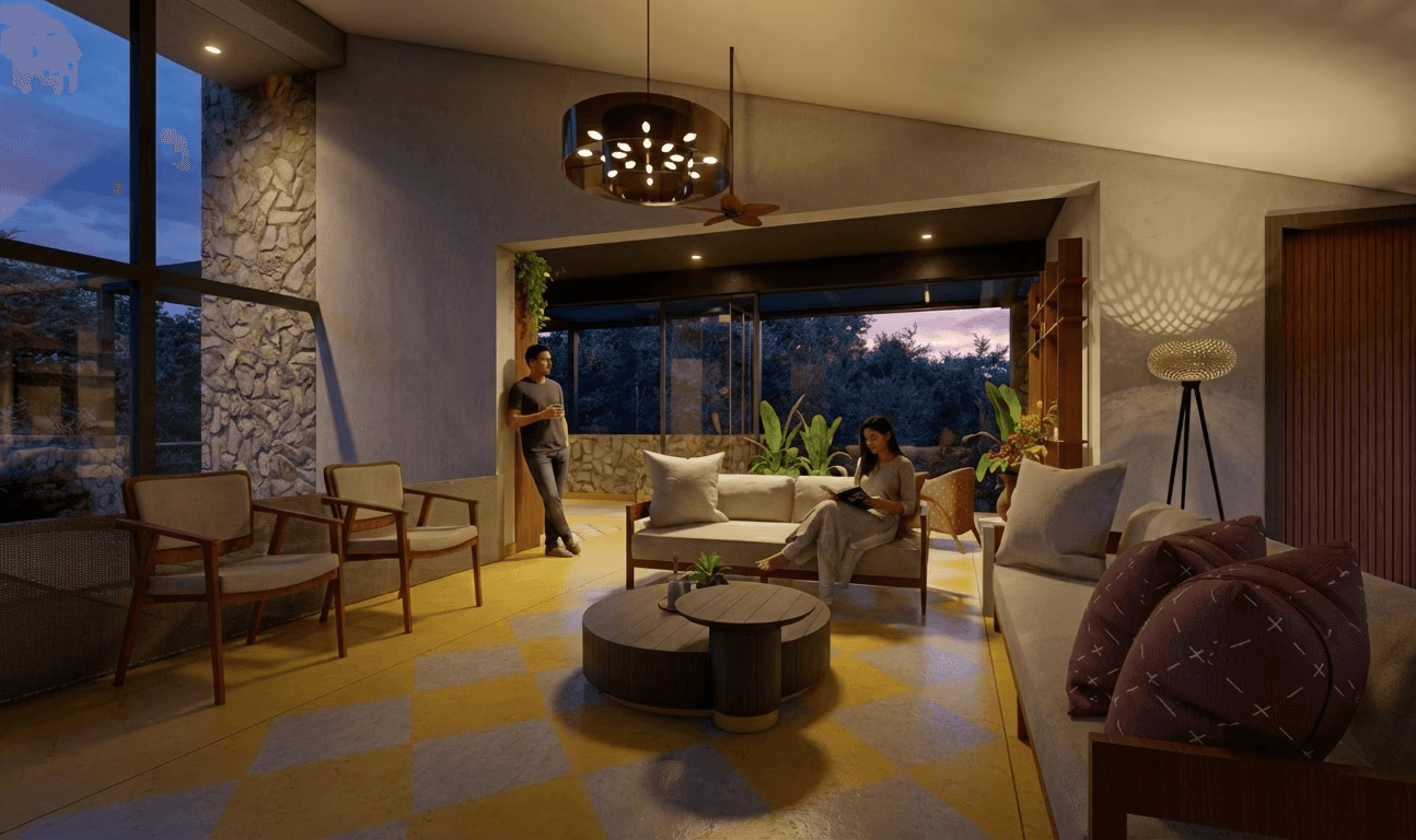 The farmhouse is organized across two levels that follow the natural slope of the site. Instead of cutting into the hill, the architecture is embedded within it, allowing the terrain to shape the built form. A sloped green roof extends from the landscape and becomes a walkable terrace, turning the building itself into part of the land. The front of the house remains fully open, bringing light deep into the living spaces and creating a continuous connection between interiors and the valley beyond.