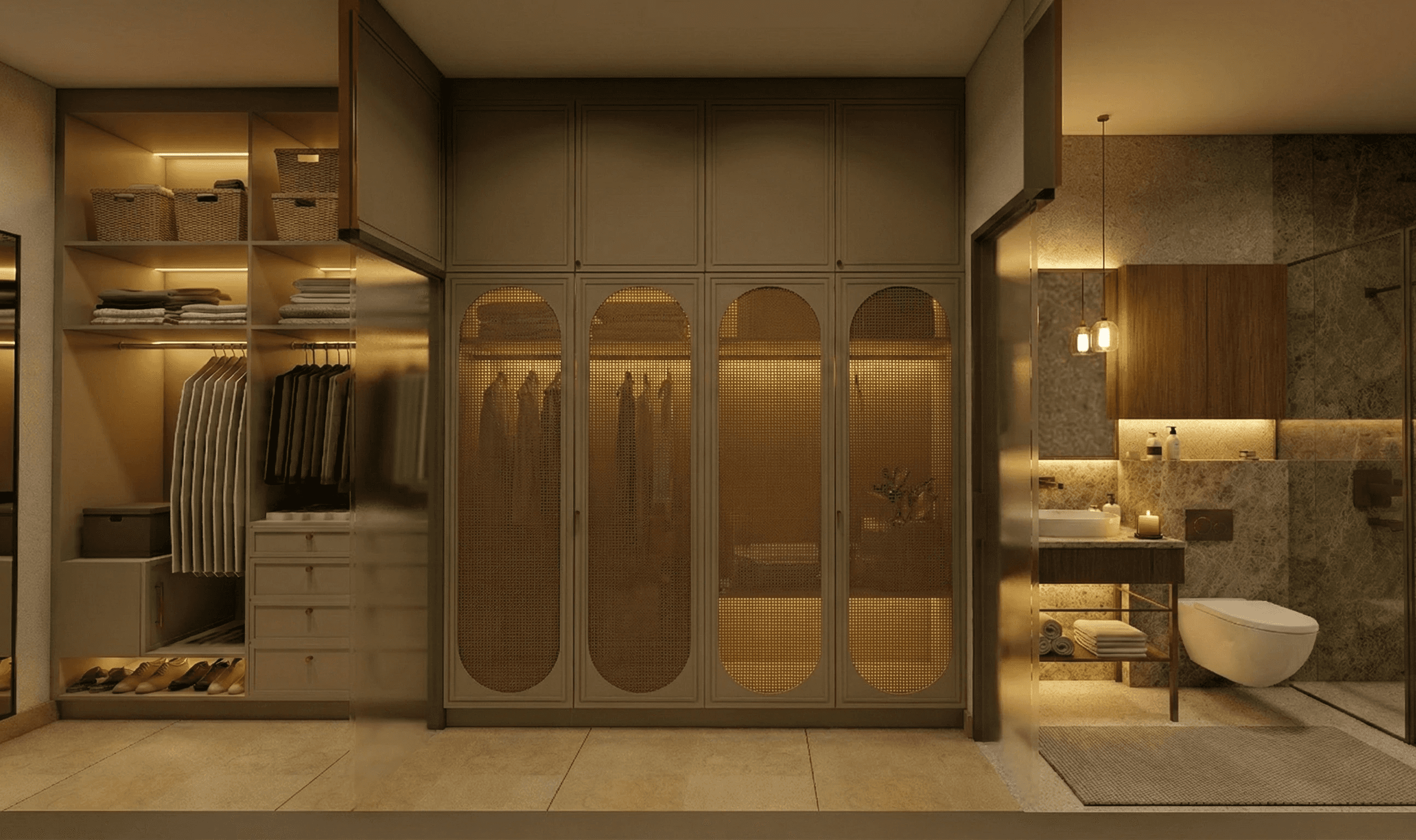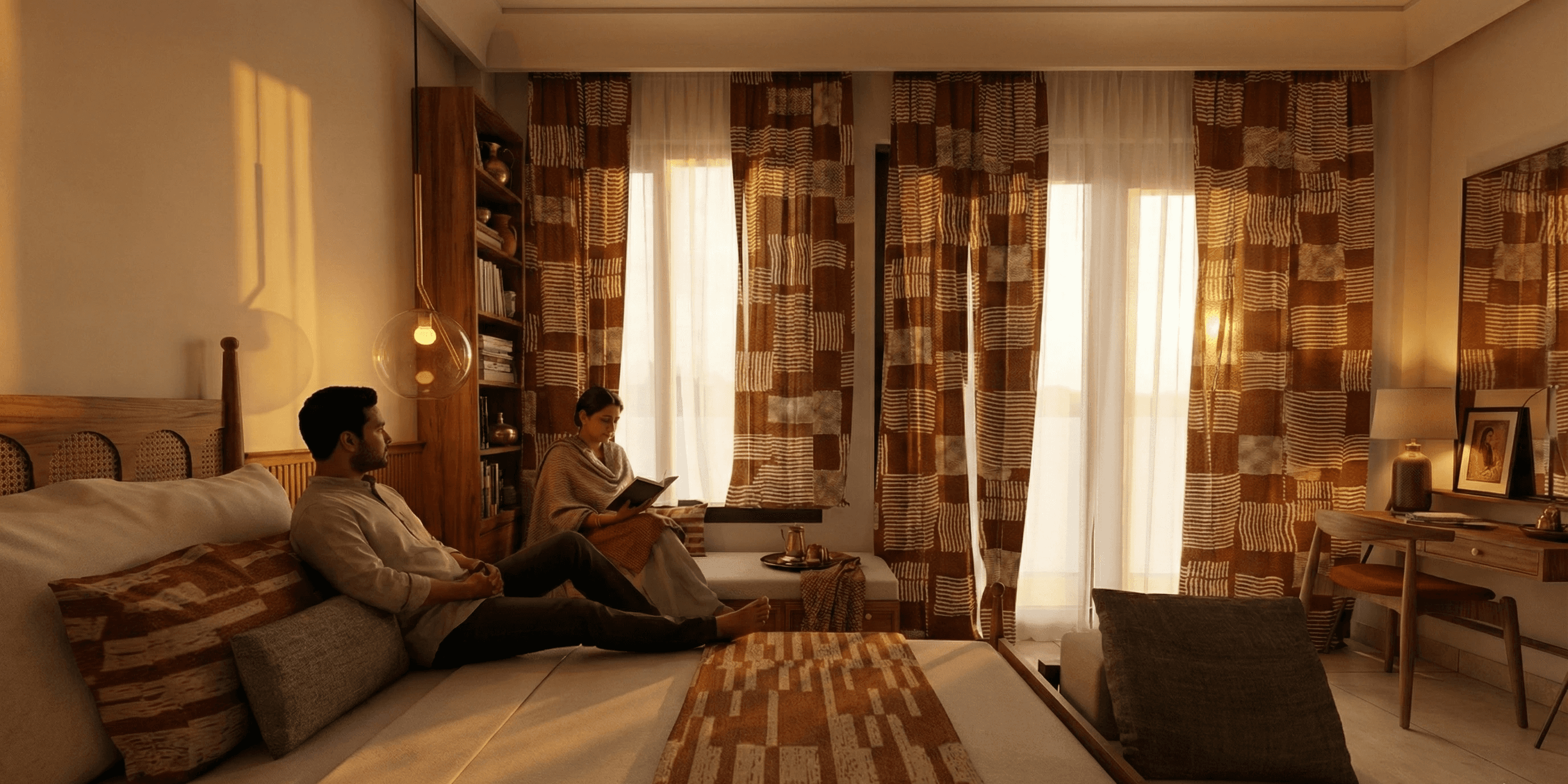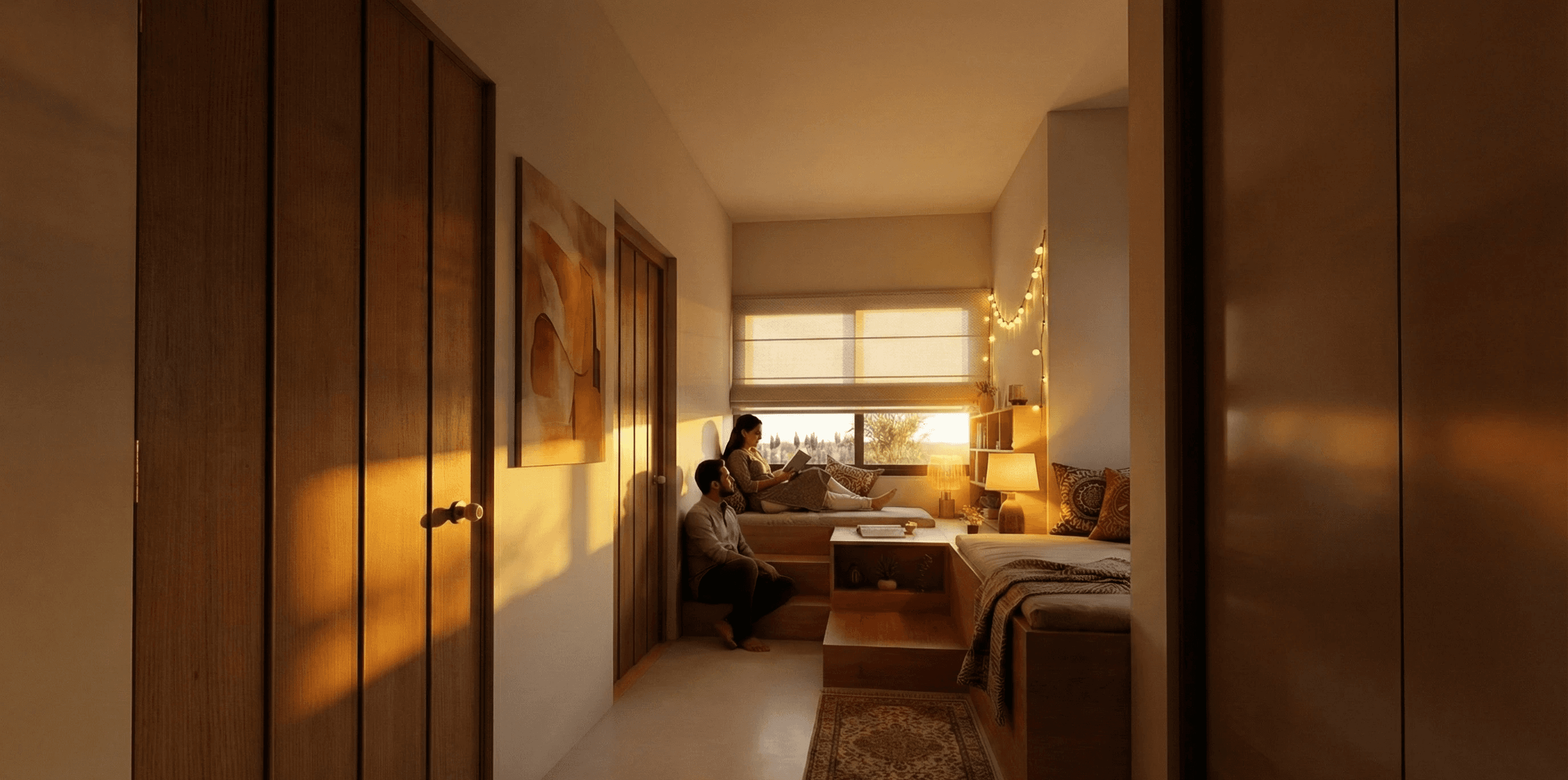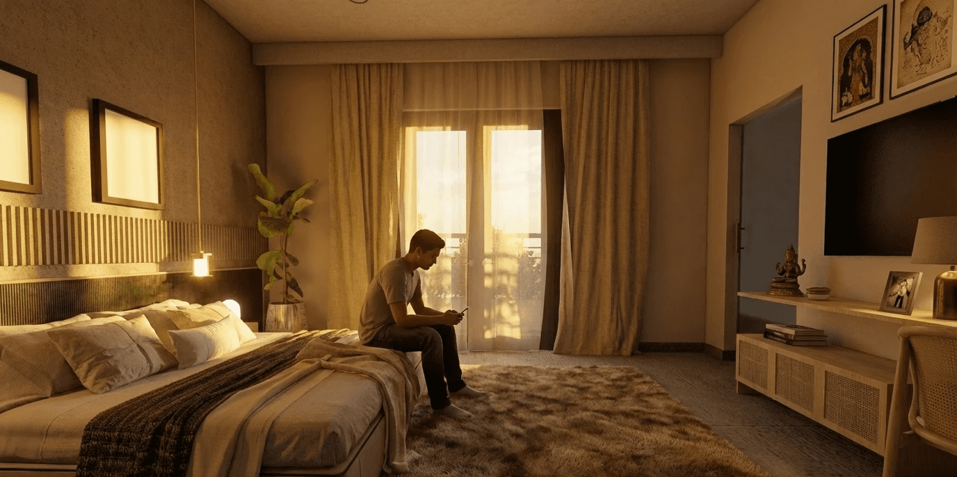 Local stone is used as the primary exterior material to give the house durability and a strong regional character. Inside, built-in seating, niches, and walk-in wardrobes are integrated into the layout to make the spaces efficient and comfortable without unnecessary finishes. Carefully shaped light and shadow soften the interior throughout the day, creating a home that feels contemporary, calm, and closely connected to how the family lives.