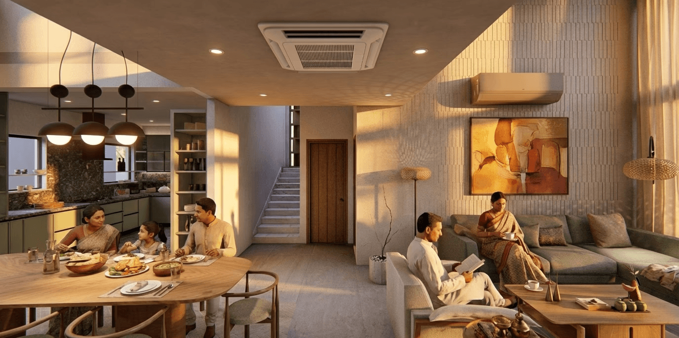 The house is organized around a double-height living space that forms the social heart of the home. A bridge on the first floor overlooks this central volume, allowing visual and acoustic connection between family members across levels. A side lawn and multiple terraces extend the living areas outdoors, while a separate block accommodates the home office and service spaces above, keeping the main residence open and uncluttered.