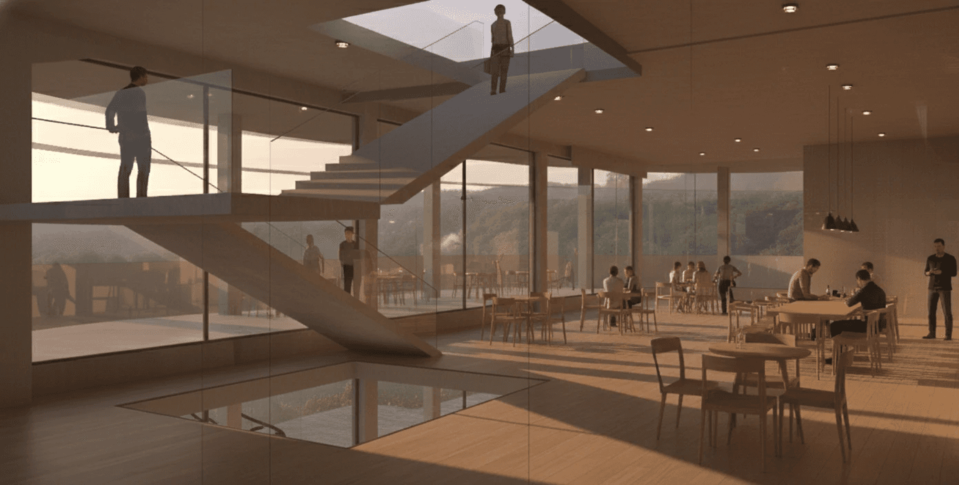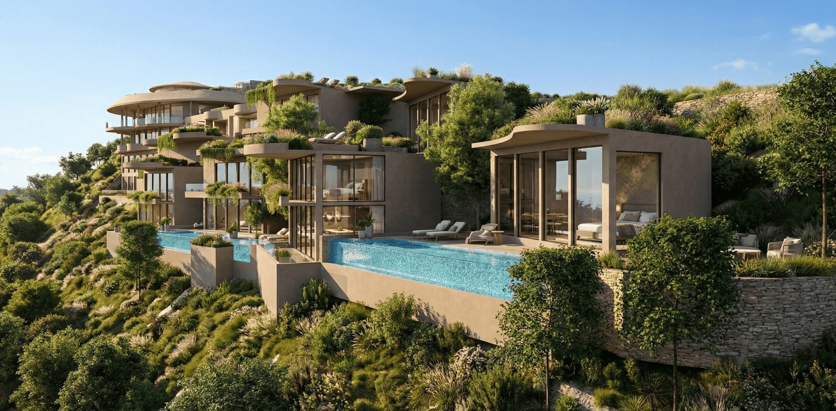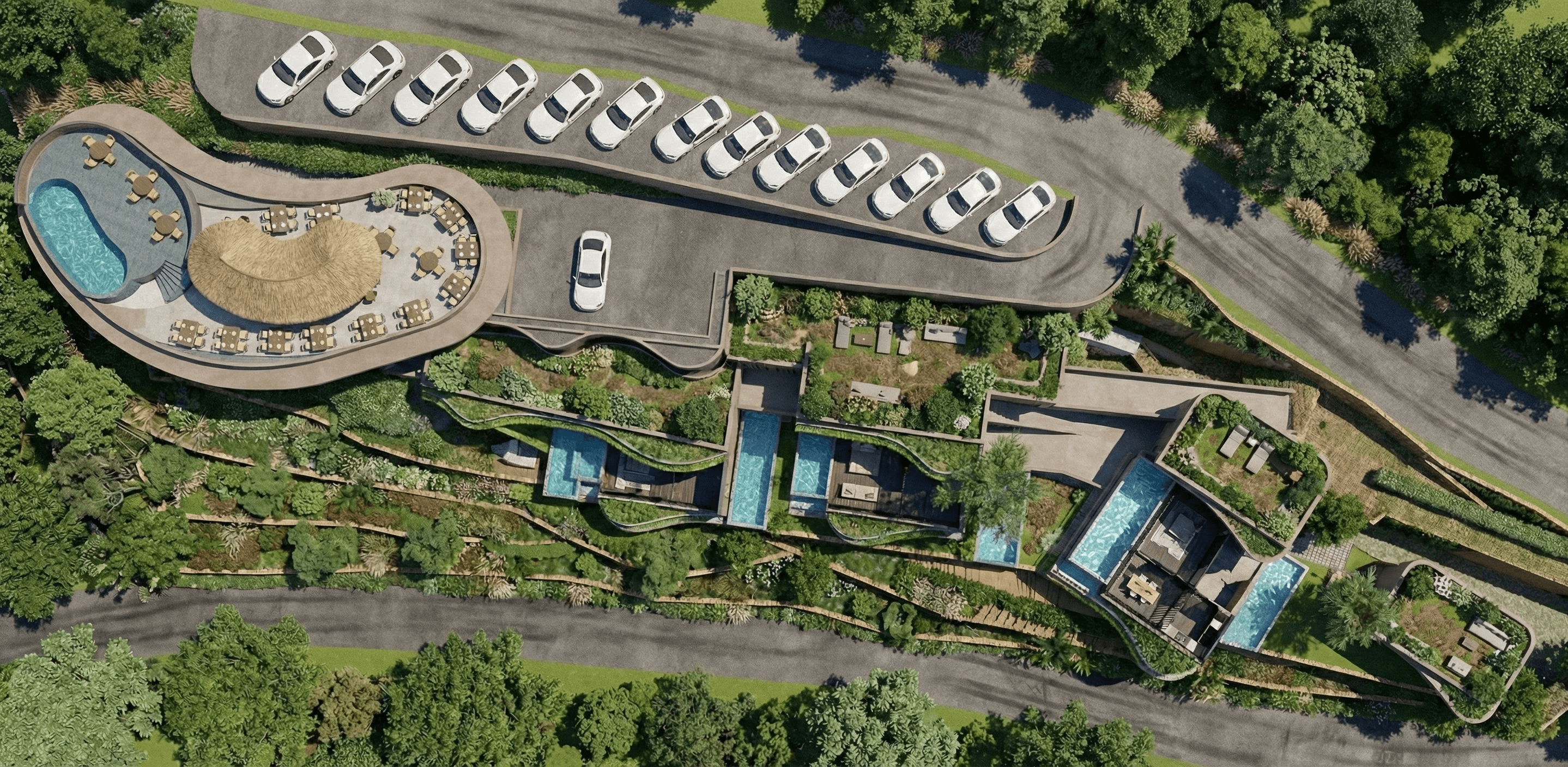 A central building at the top of the site houses reception, café, dining, and shared facilities, while the accommodation cascades down the hillside through green-roofed terraces and private plunge pools. This arrangement minimizes the visual impact of the built form while improving privacy and thermal performance. Circulation moves gradually down the slope, creating a slow, layered arrival experience that reflects Rishikesh’s character as a place of retreat and reflection, while remaining efficient and serviceable as a hospitality development.