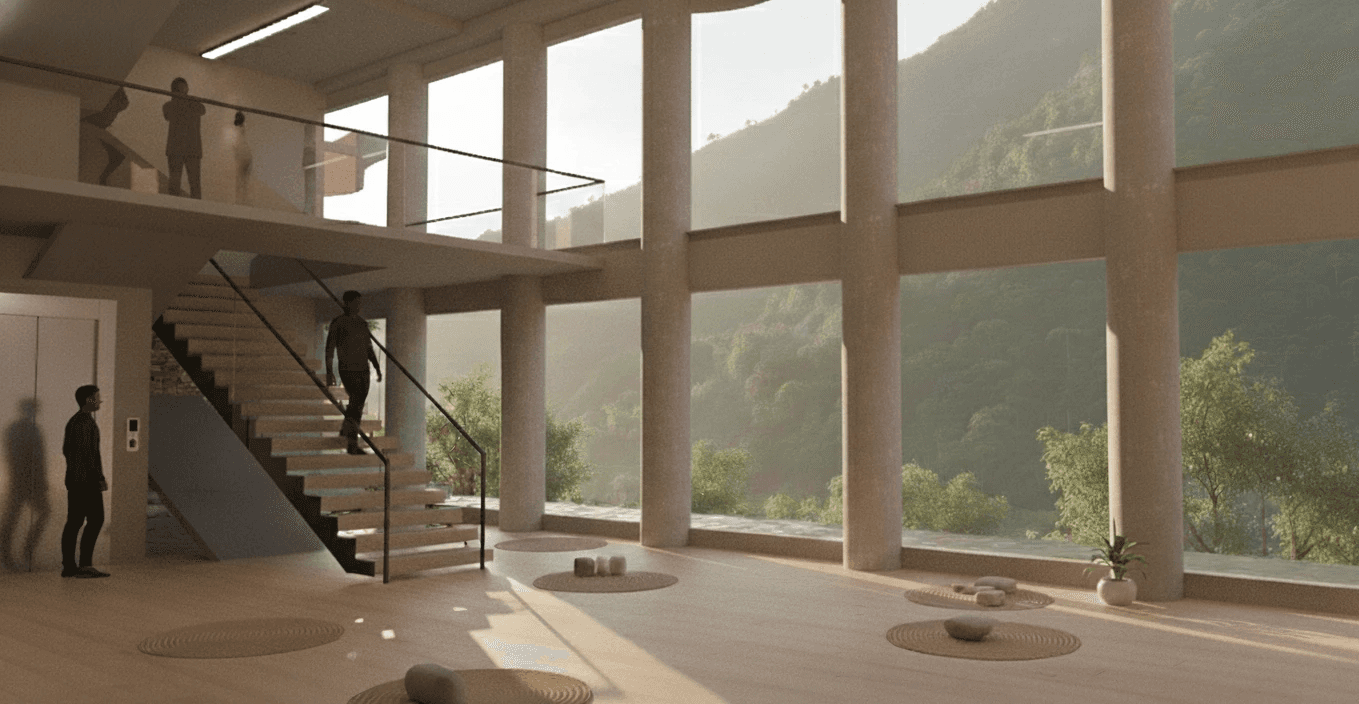 The resort is planned as a series of stepped terraces that follow the natural slope of the land rather than cutting against it. Eight private villas and guest rooms within the main building are arranged so that every unit maintains a continuous visual connection with the Ganga and the valley below. This ensures that the primary experience of the resort — light, air, and landscape — remains present from every room, regardless of its level.