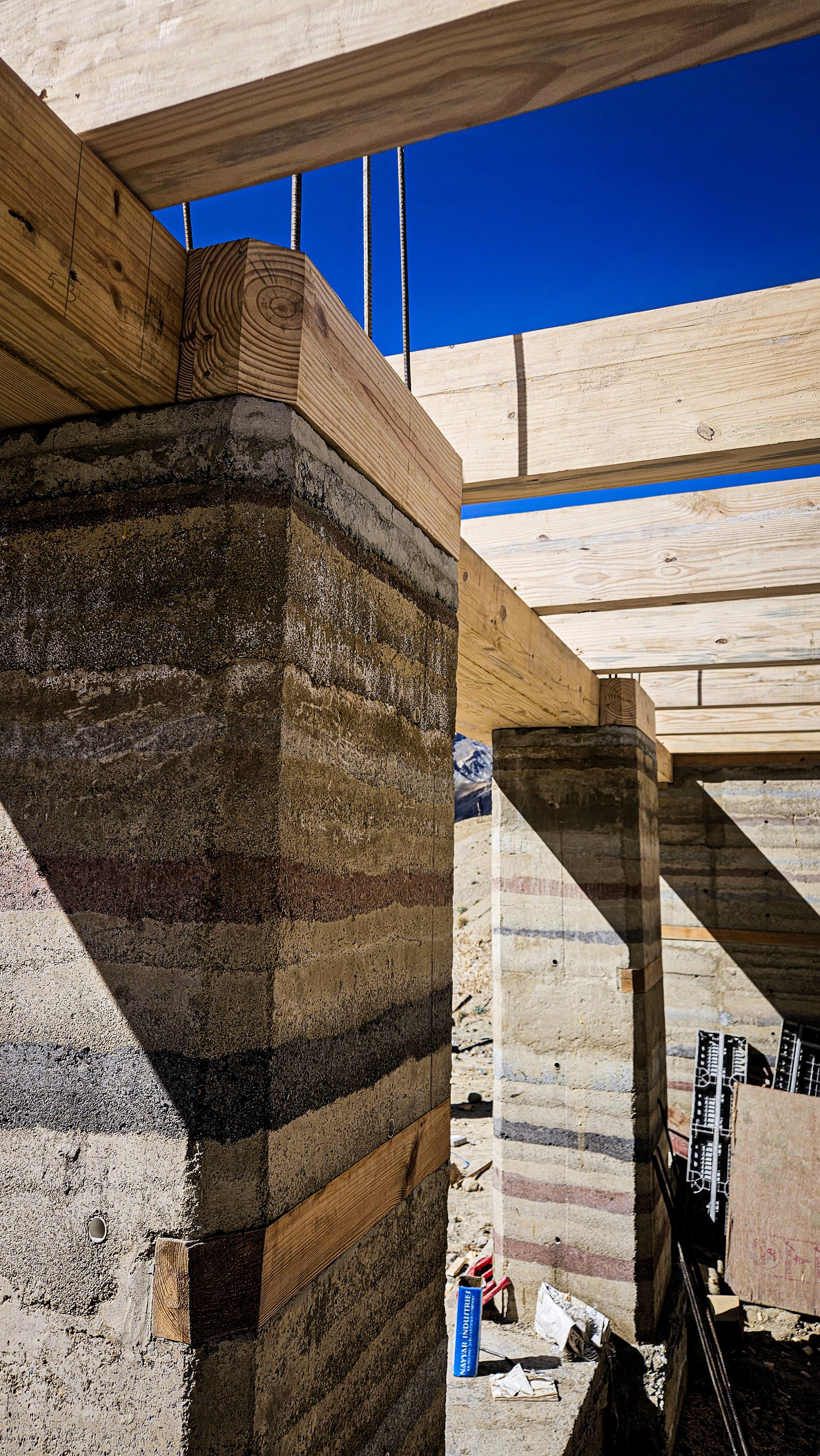 The SDPS campus was developed in collaboration with Chybik + Kristof Associated Architects, with The Blue Khirki responsible for project management and on-site realization. The architecture draws from traditional Ladakhi building methods while reinterpreting them through modern construction techniques. Insulated structural rammed-earth walls and timber ceilings form the primary building system, providing thermal mass, durability, and a strong connection to local material culture.